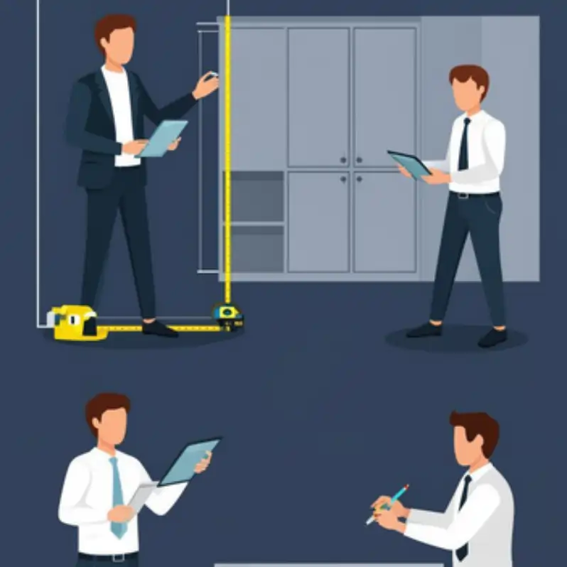 - Измерение помещения: точное измерение всех параметров комнаты для правильного размещения шкафов и гардеробных.