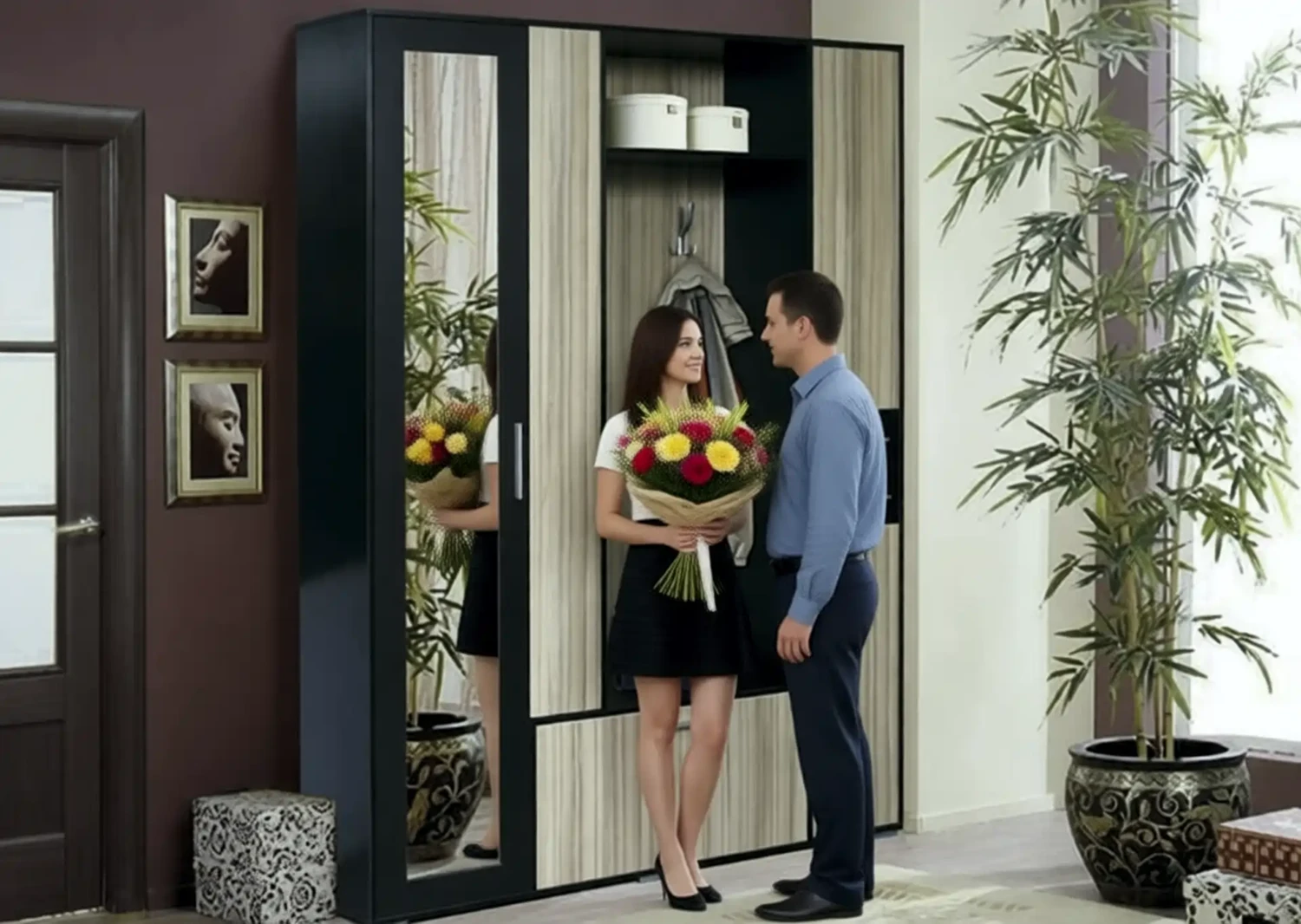 Это слово — отголосок грации и внутреннего таланта к созданию гармонии. Оно несет в себе смысл таланта — ведь эта мебель умеет сочетать контрасты: глубокий черный корпус и светлый деревянный рисунок, строгие линии и мягкие отражения в зеркале. Это талант — превратить функциональность в эстетику. И это талант — сделать так, чтобы даже самая обычная вещь — пальто или сумка — становилась частью композиции, а не просто хранилась где-то в углу.