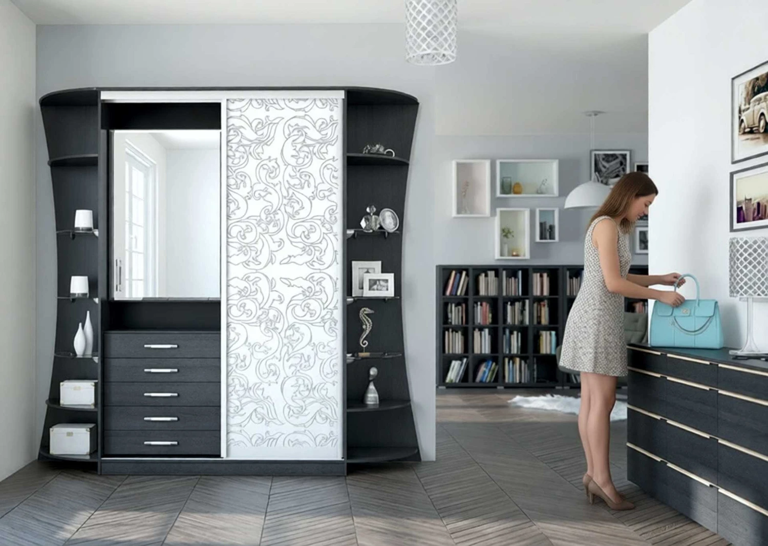 - Орнаментальная сторона: Вторая дверца — это белоснежное полотно, украшенное сложным серым узором в стиле барокко. Этот орнамент — не просто декор, это поэзия линий, написанная на поверхности шкафа. Он добавляет шкафу глубины, роскоши и индивидуальности, превращая его в настоящую художественную инсталляцию.